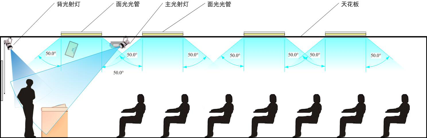 灯盘格栅:安装光管和镇流器;而采用光管盘布光时,由于光管盘和栅格的阻挡,大约为50%左右。同时,也是因为一般照明用光管盘对光能射出角度的阻隔,其射出夹角在50°左右。如图“录播拍摄现场的面光布光”所示。